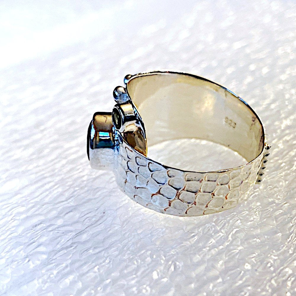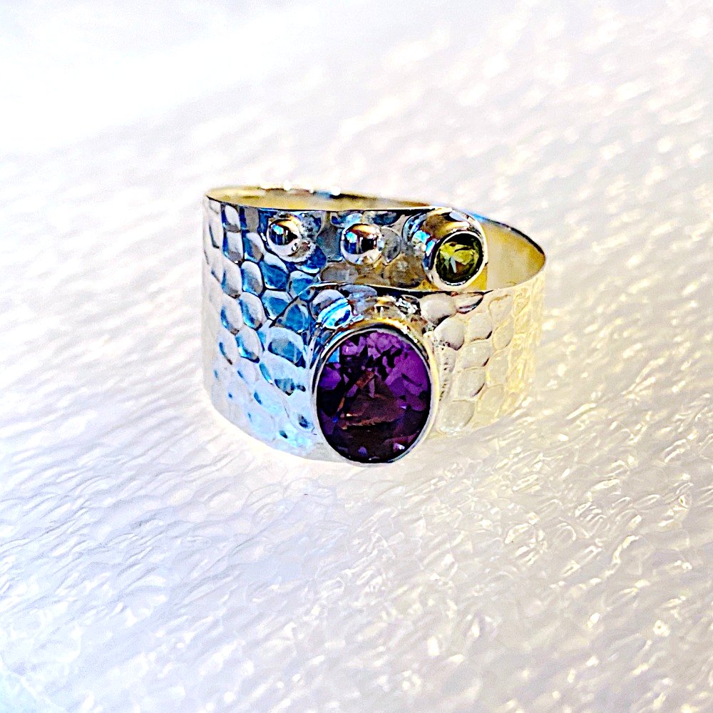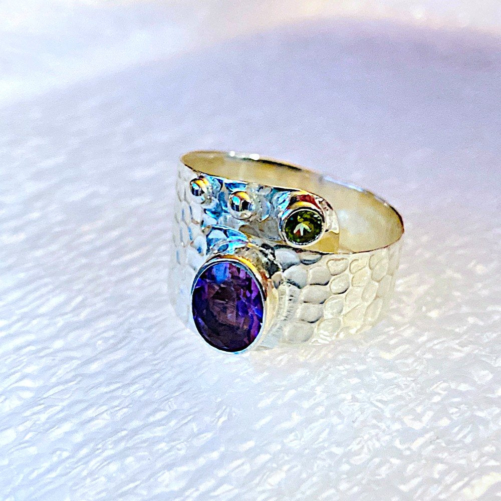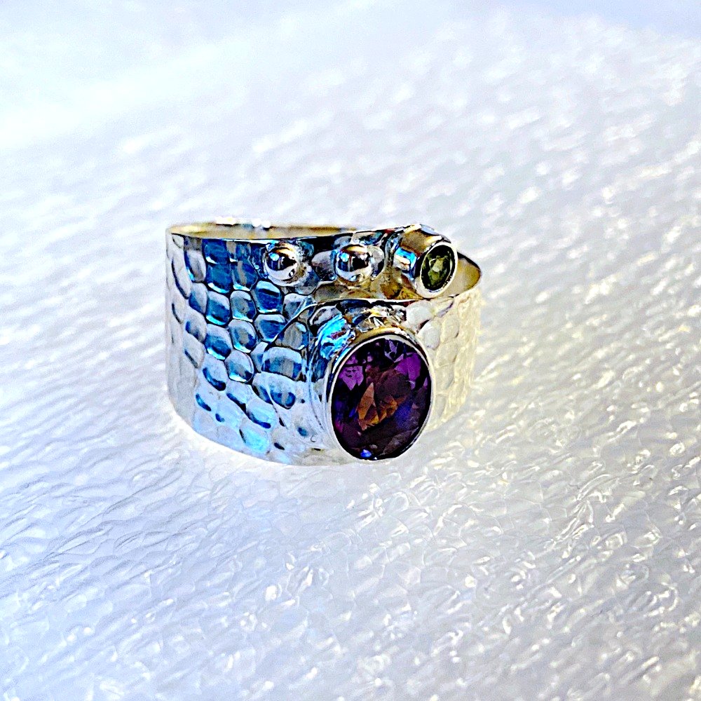 A ring this pretty and it's adjustable! A medium-sized oval Amethyst stone centers this ring. The Amethyst is a little lighter in color than the photos. Above the Amethyst stone is a small Peridot stone. The ring band is hand hammered sterling silver on the outside and smooth sterling silver on the inside.