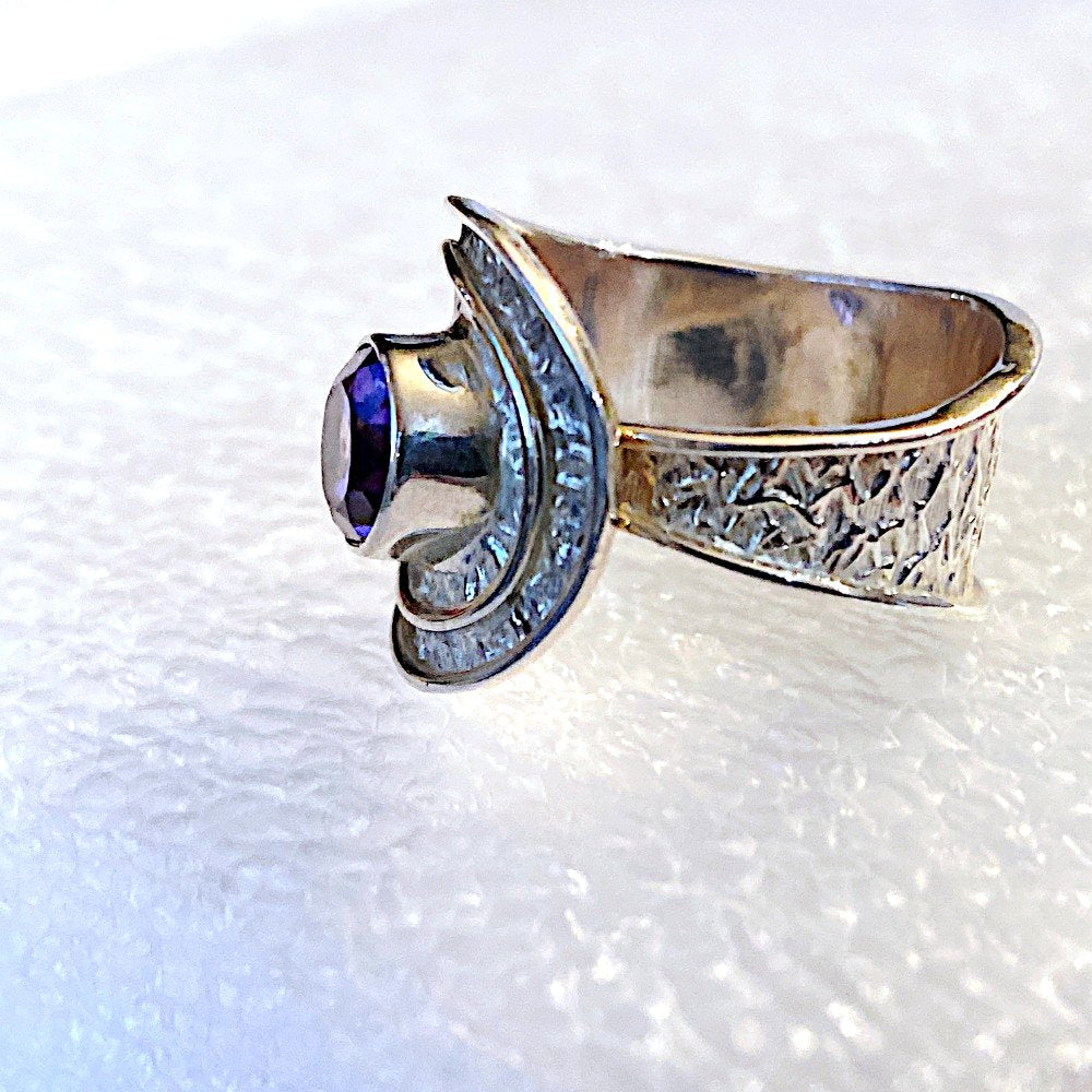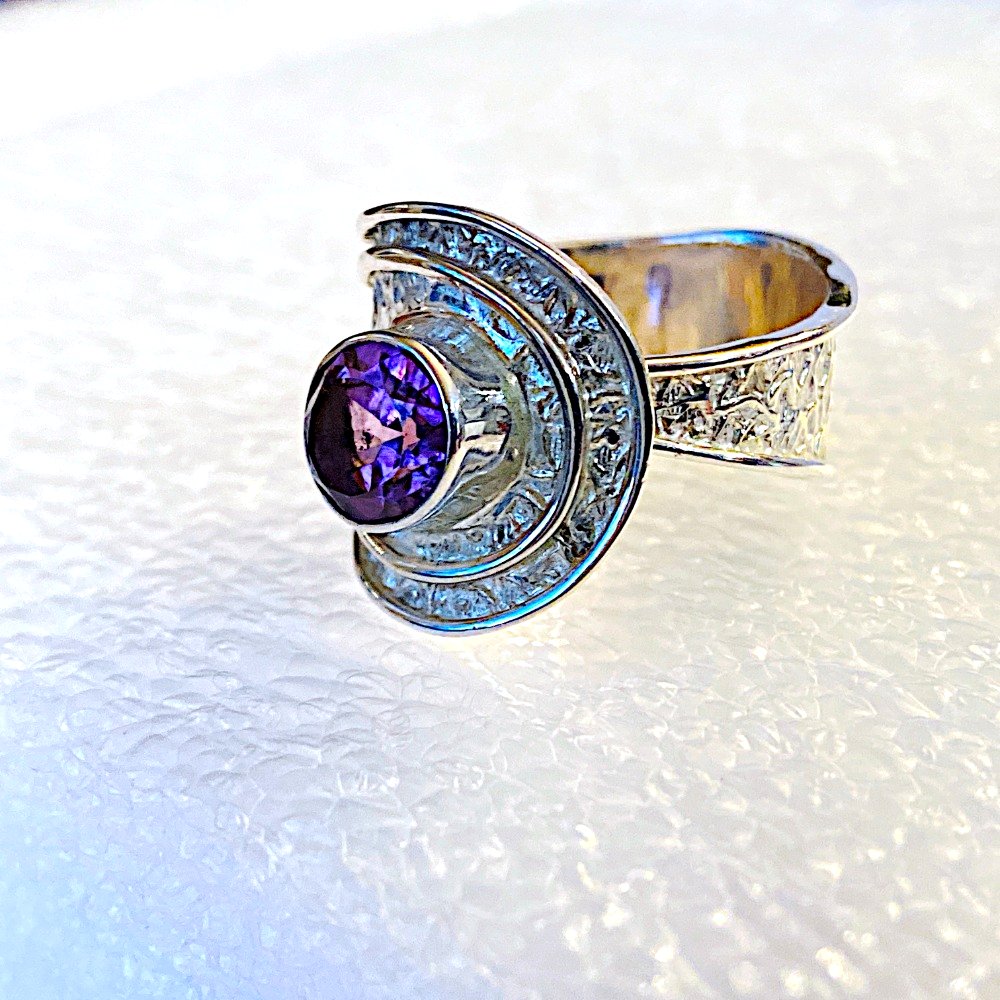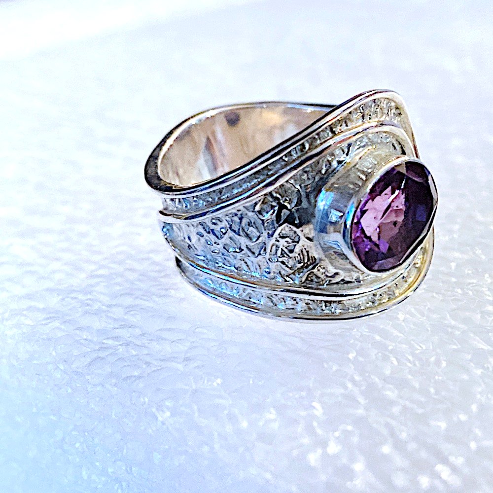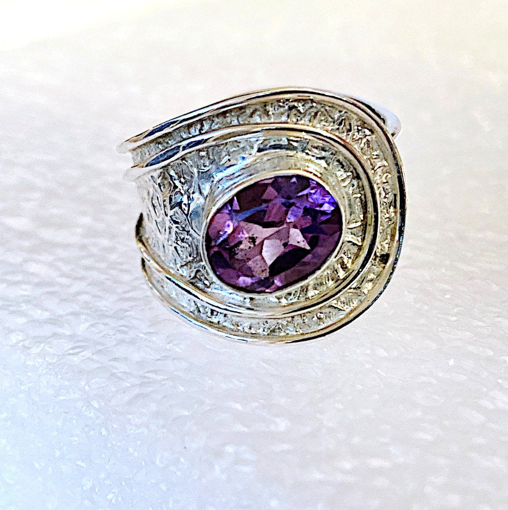 A deep amethyst gemstone centers this adjustable ring as textured sterling silver swirls all around it. It's an elegant ring that will surely get noticed. Amethyst is believed to be a calming stone to relax your mind, body and spirit. Who can't use more of that?