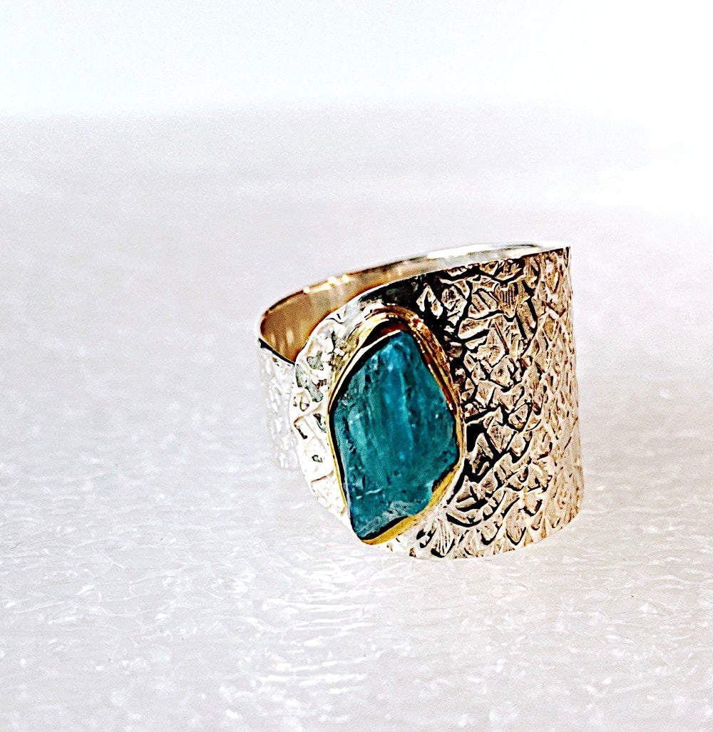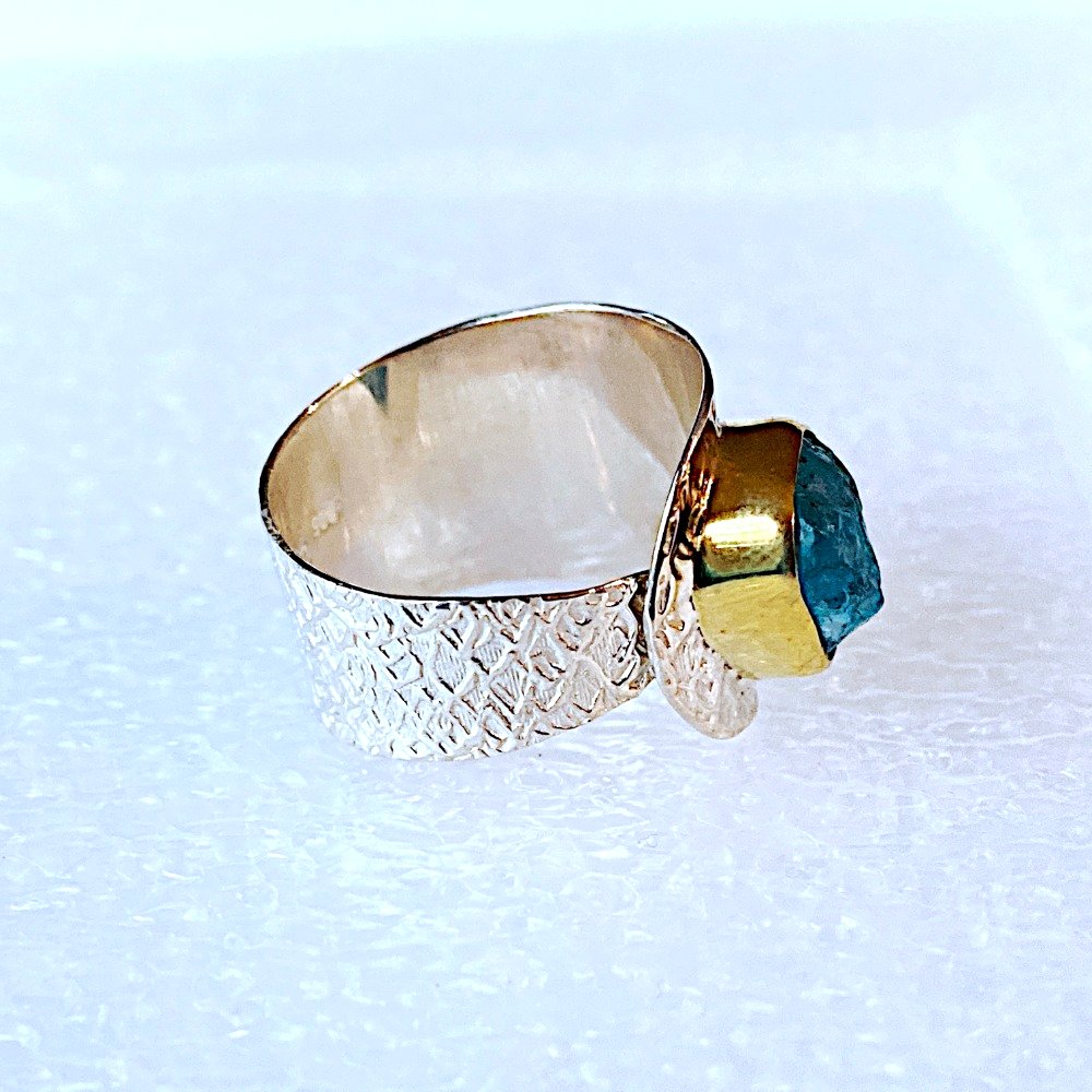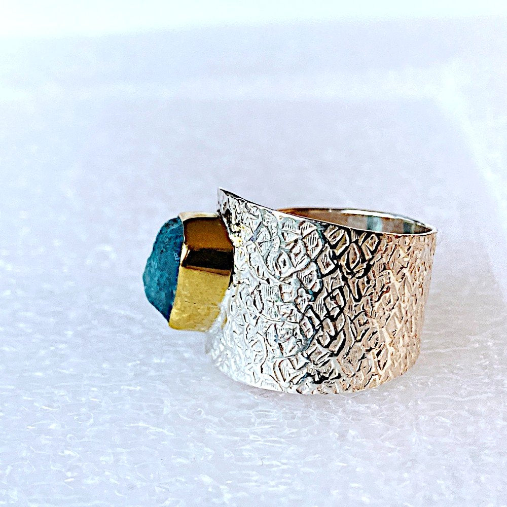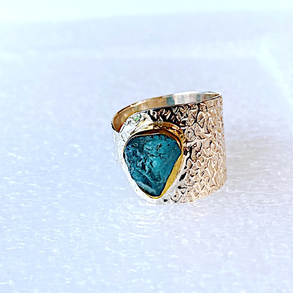 A raw chunk of Blue Apatite is the centerpiece of this pretty adjustable ring. The color of this stone is like Caribbean blue water. The wide sterling silver band is hammered and textured. The inside band is smooth sterling silver. This would be a perfect gift for anyone who loves the ocean.