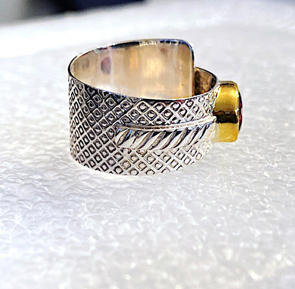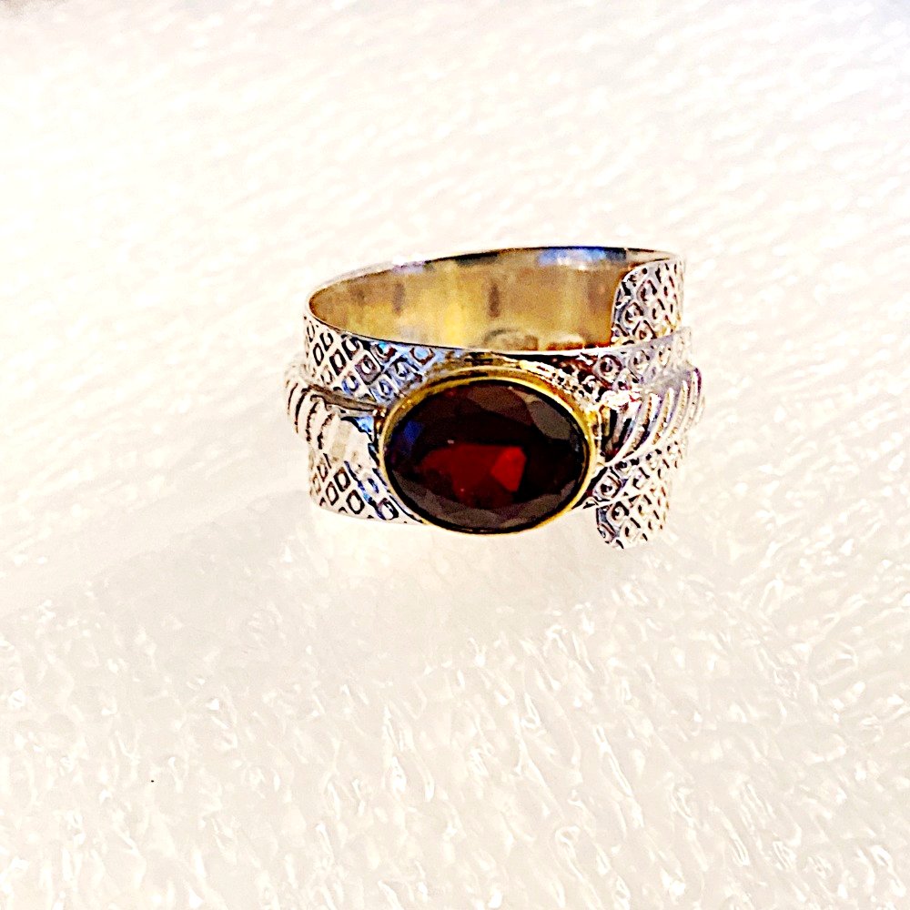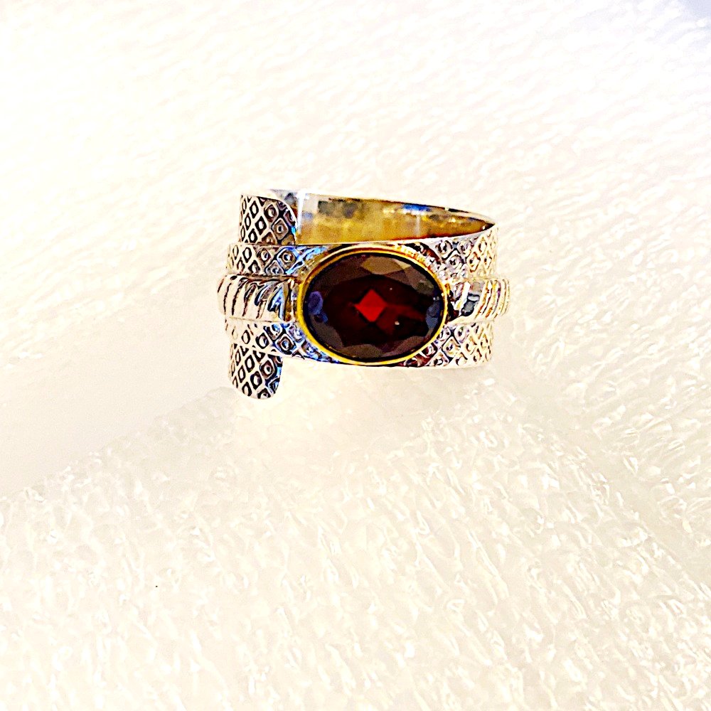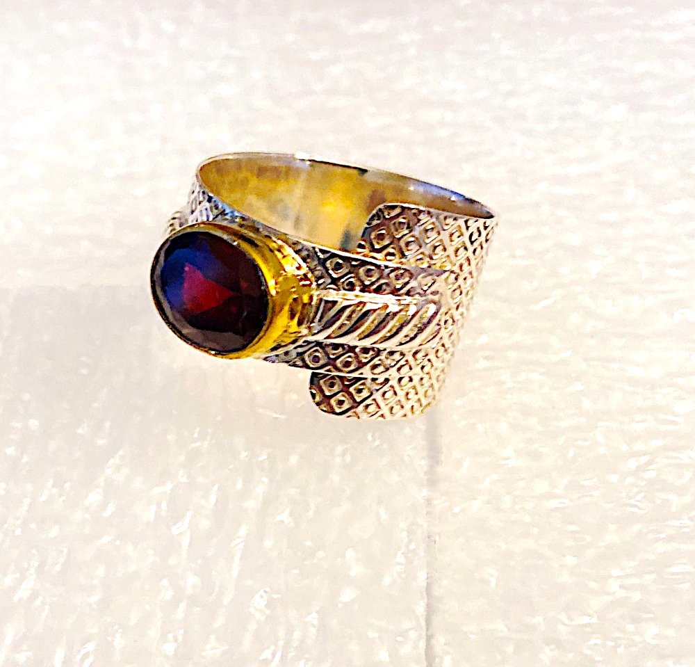 A deep red garnet seems to float in the middle of this adjustable ring. The sterling silver band has a subtle pattern all around. The inside of the band is smooth sterling silver.