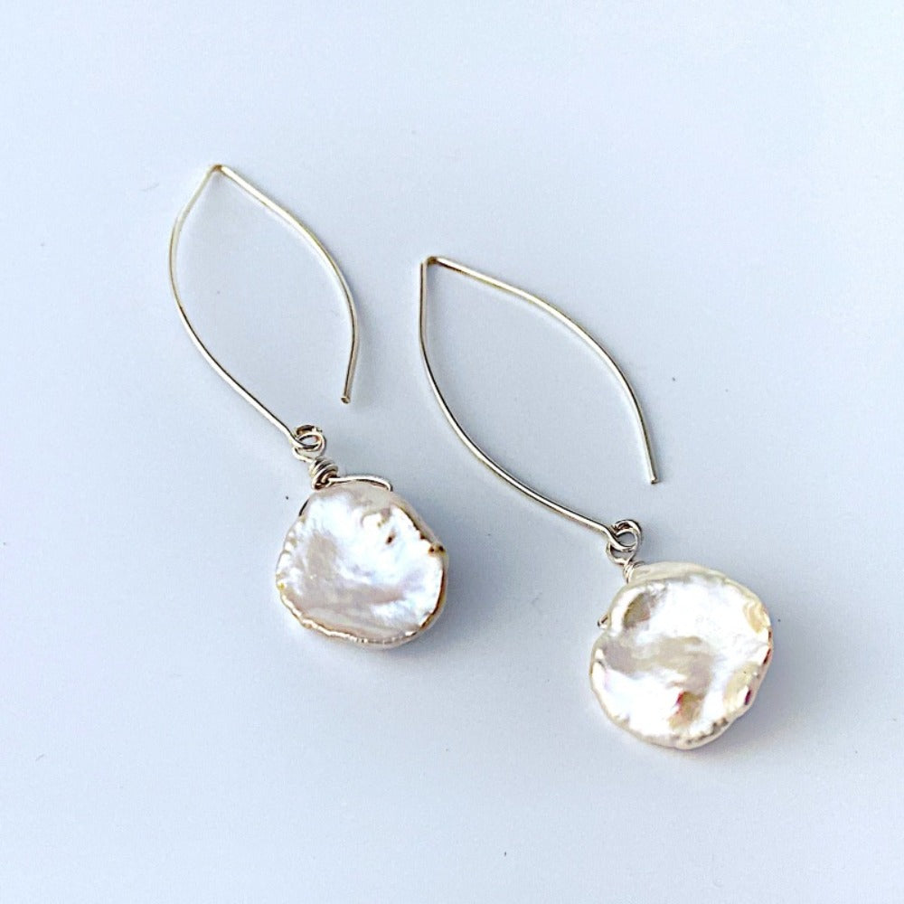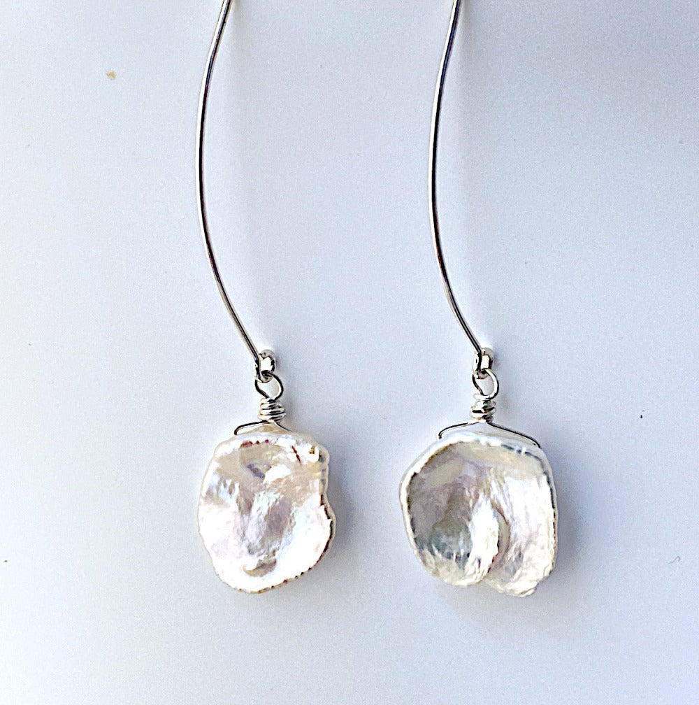 These long Keshi Pearl earrings are classic with a twist. Each pearl is unique in shape and has shimmers of cream, blue, violet and pink. These beautiful pearls hang from long sterling silver ear wires. They are about 2 inches in length total.