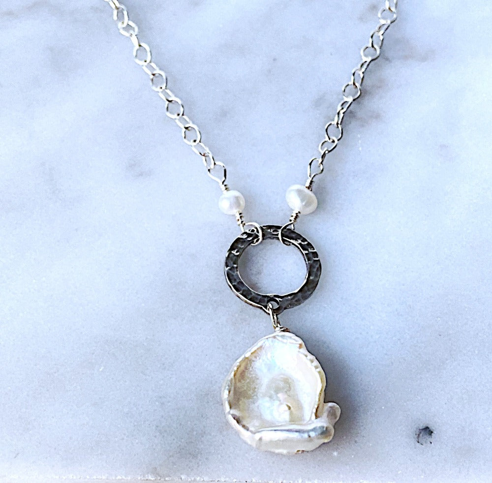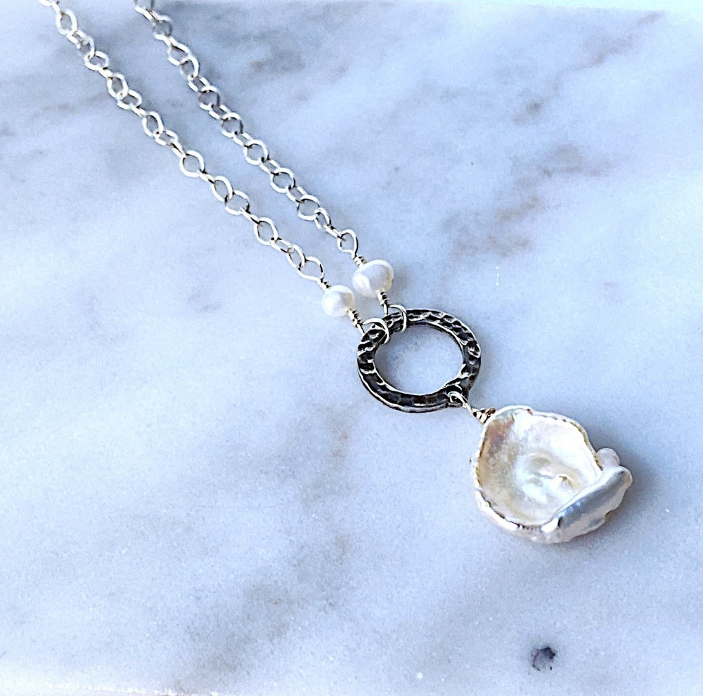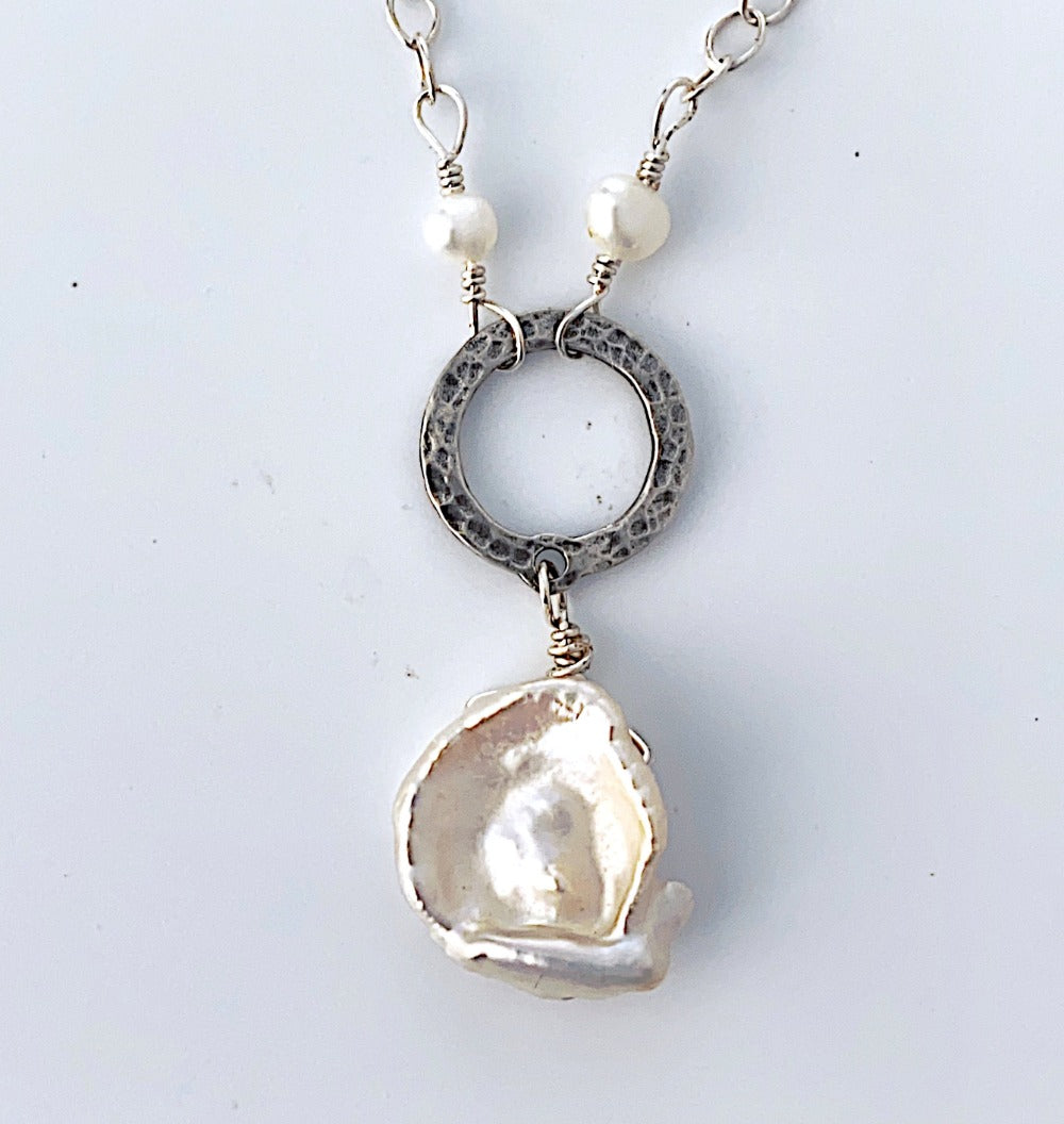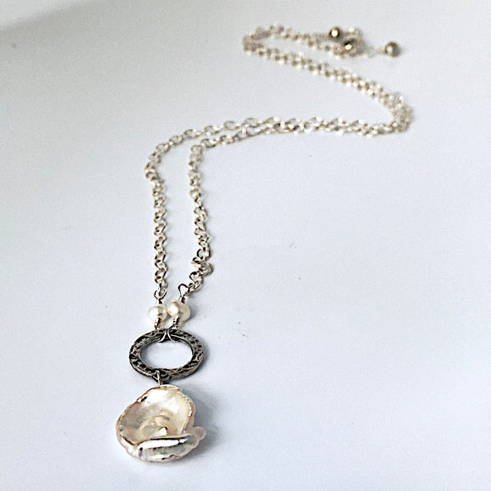 Keshi pearls have beautiful luster and unique shapes. This Keshi pearl, about the size of a nickel, is wrapped in sterling silver and hangs from an oxidized sterling silver textured ring. The sterling silver chain can be sized up to 20 inches.