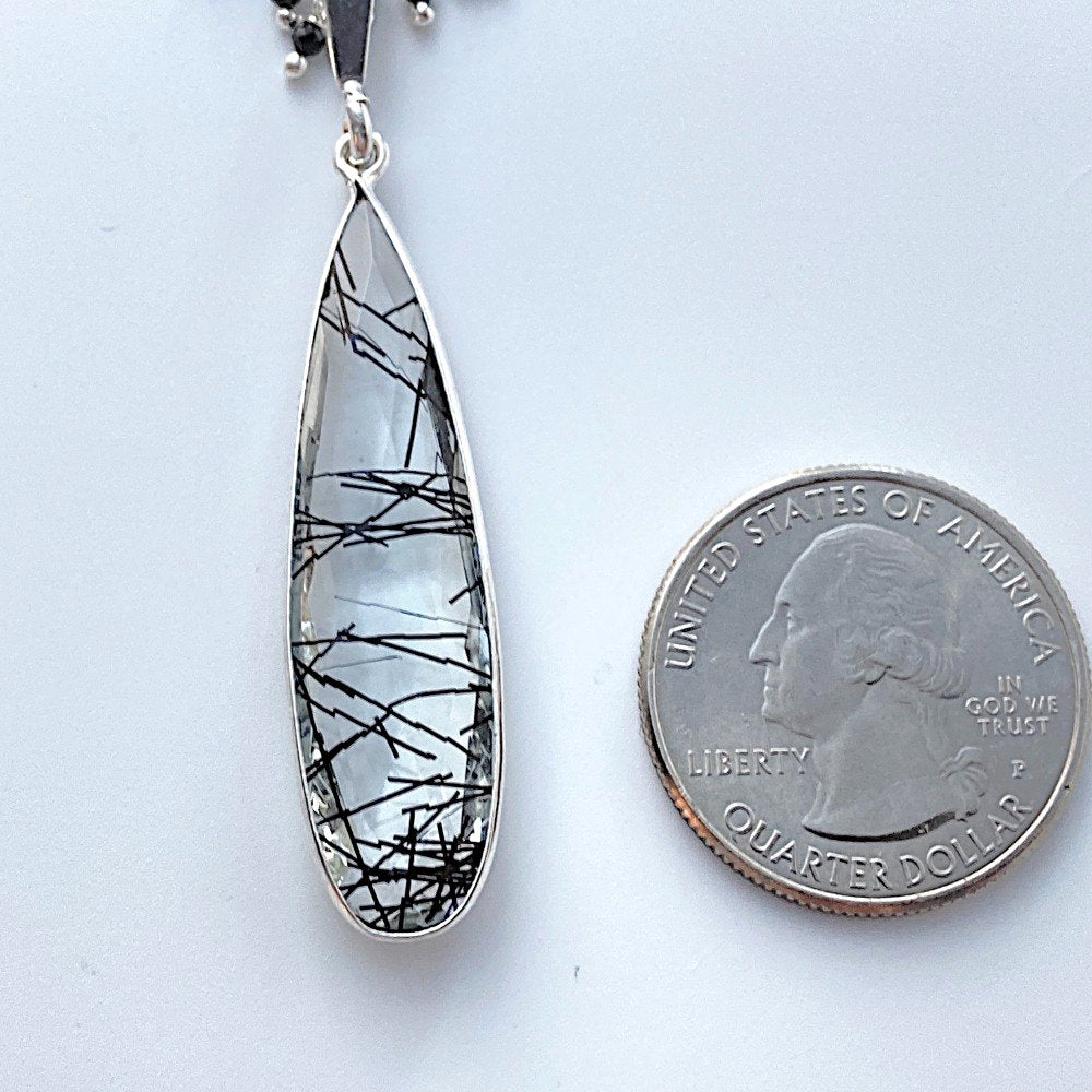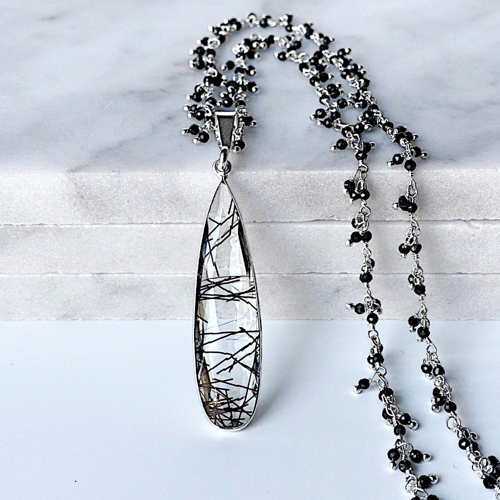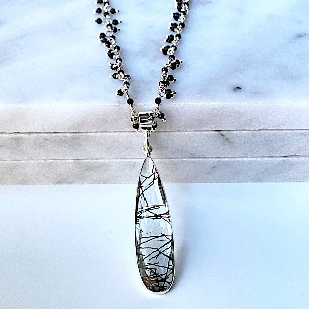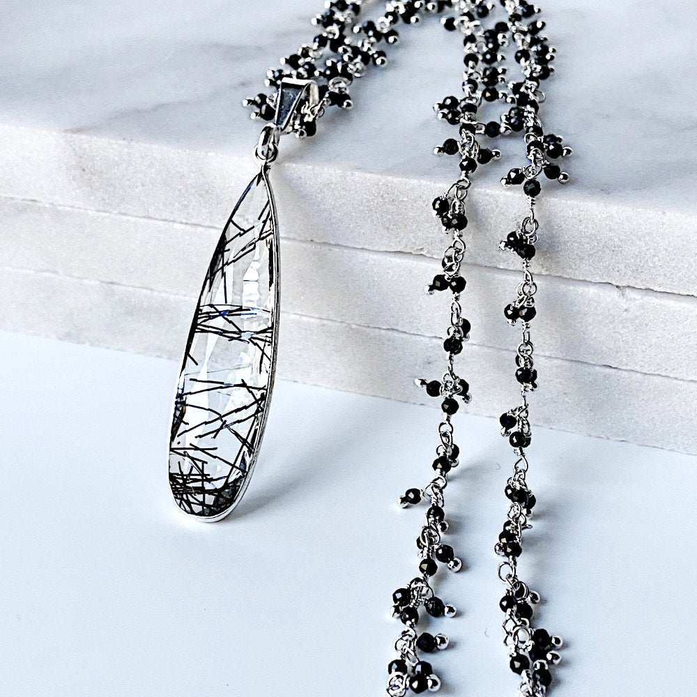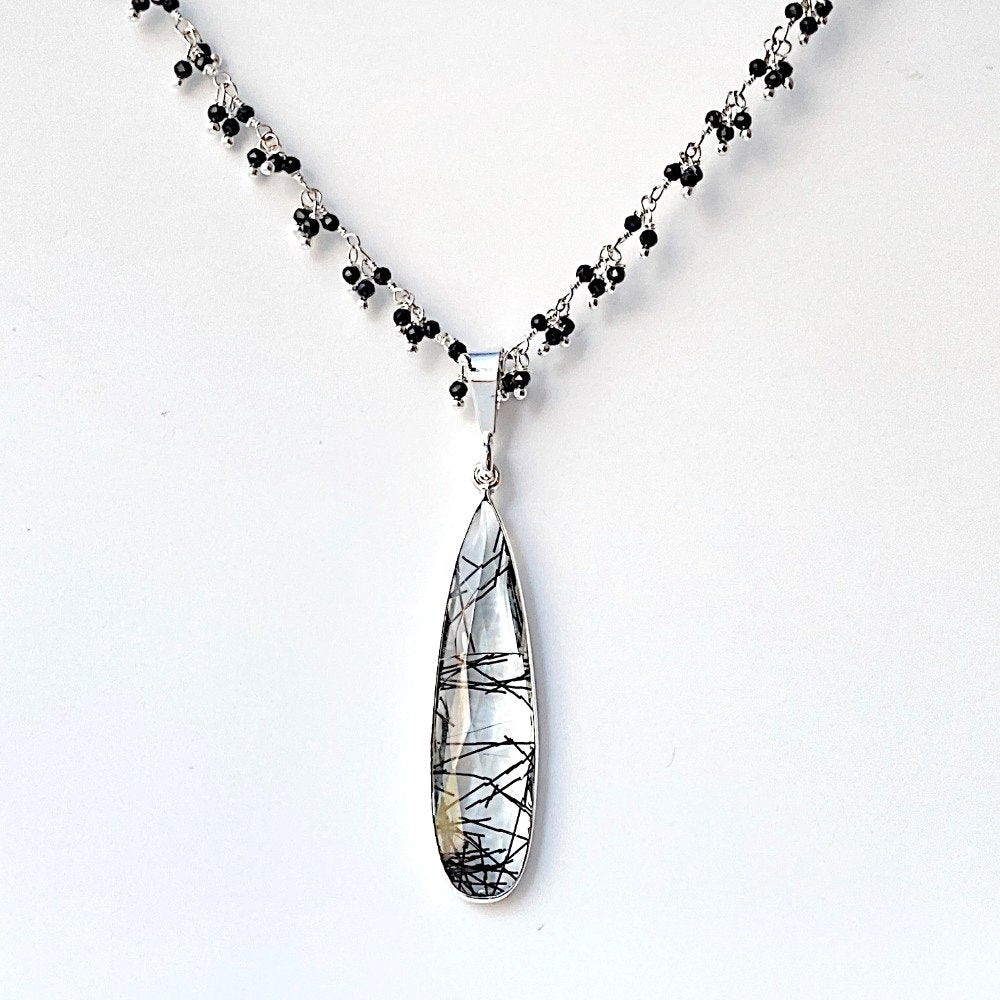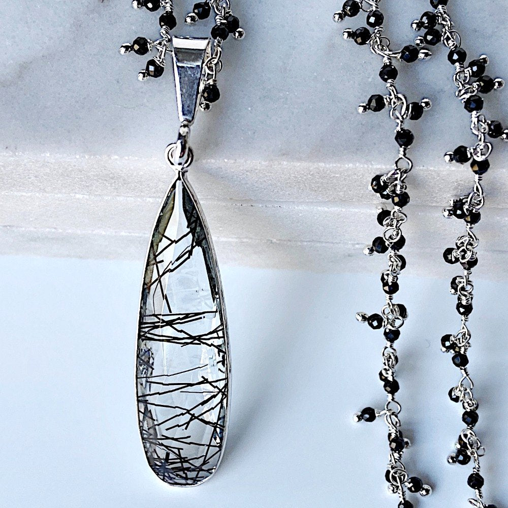 This Rutilated Quartz necklace makes quite the statement! A long Black Rutilated Quartz Pendant sways from a 24-inch chain. The chain is made of tiny Black Spinel beads wrapped in sterling silver. The black beads and sterling silver shimmer as the light plays along the necklace. The pendant can be removed and the black beaded chain can be worn by itself. This is an elegant piece of jewelry you won't see on anyone else!