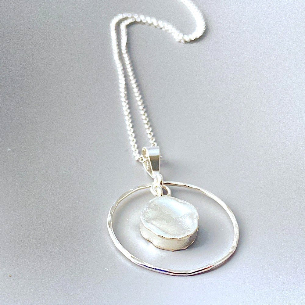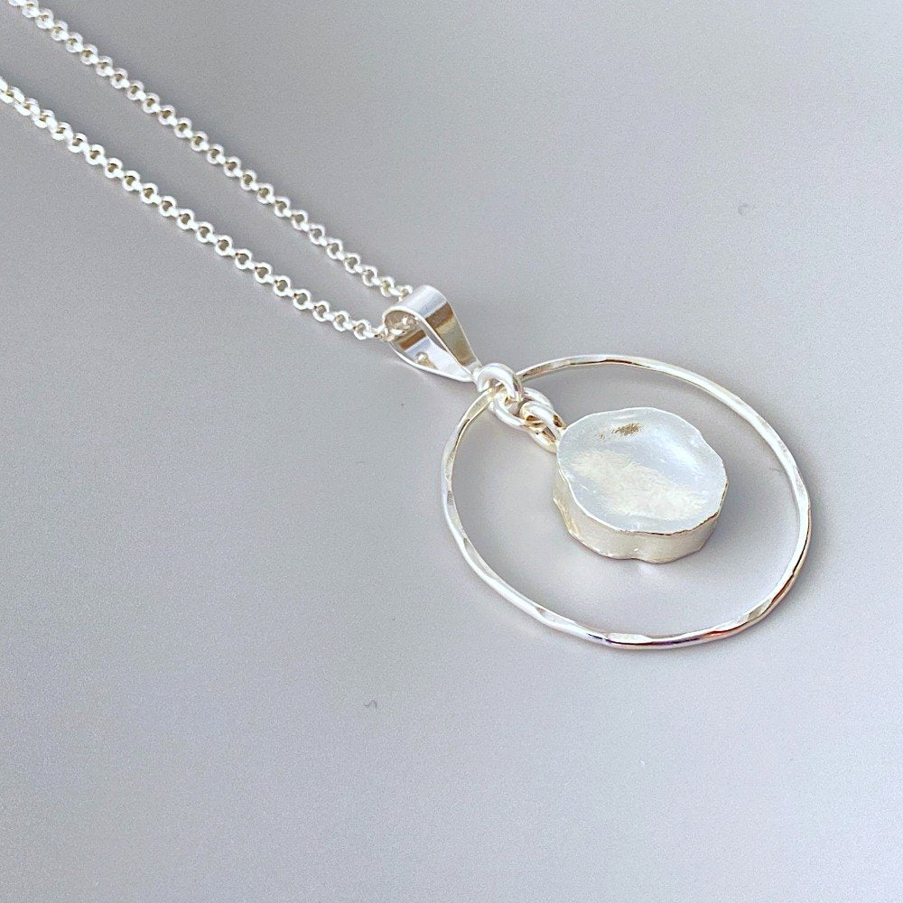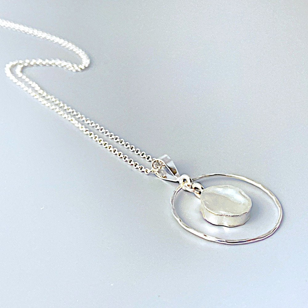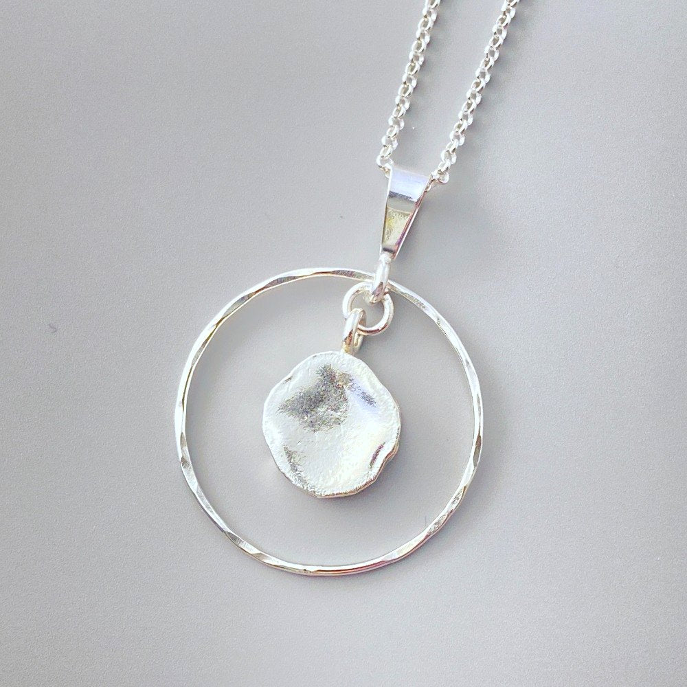 This sterling silver ring necklace makes a great everyday necklace. A sterling silver drop swings from the center of a hand hammered sterling silver ring. The outer ring is about the size of a quarter and the sterling silver chain is 18 inches in length.