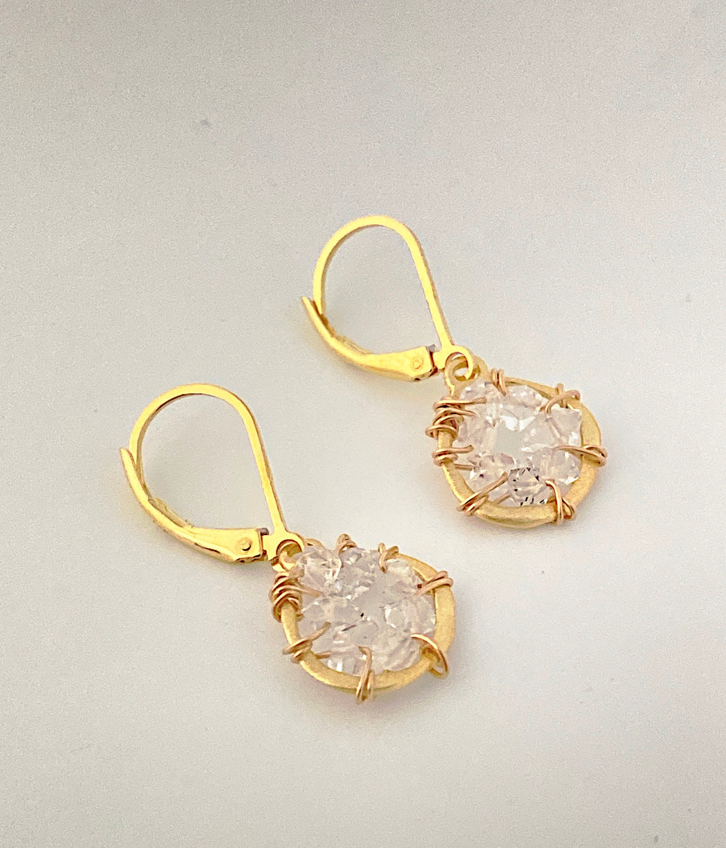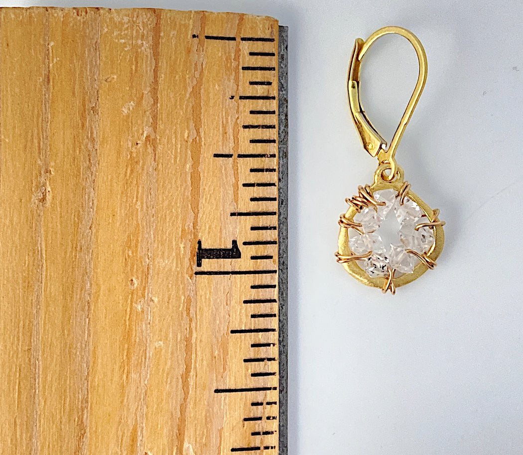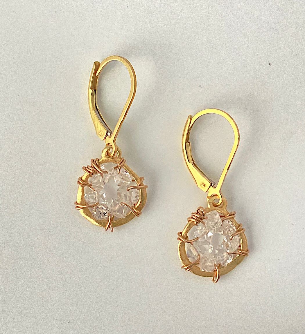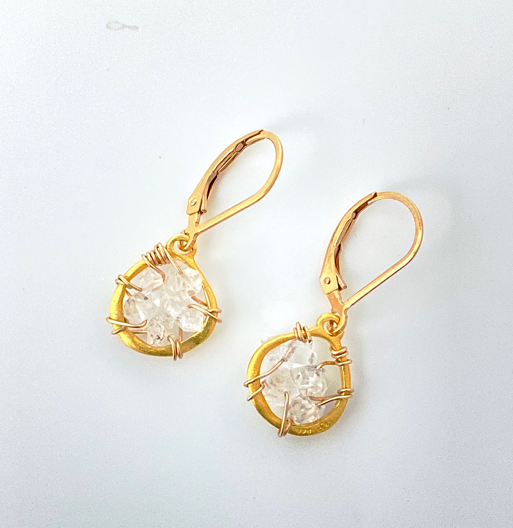 Herkimer diamonds, mined in Herkimer, NY, are arranged in a dream catcher design on a 14k gold-filled organic disc. 14k gold-filled leverback ear wires make sure you never lose these earrings. The earrings are pretty, petite and elegant. One of our best sellers!