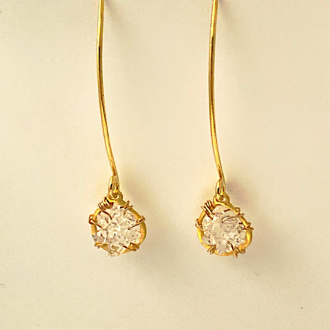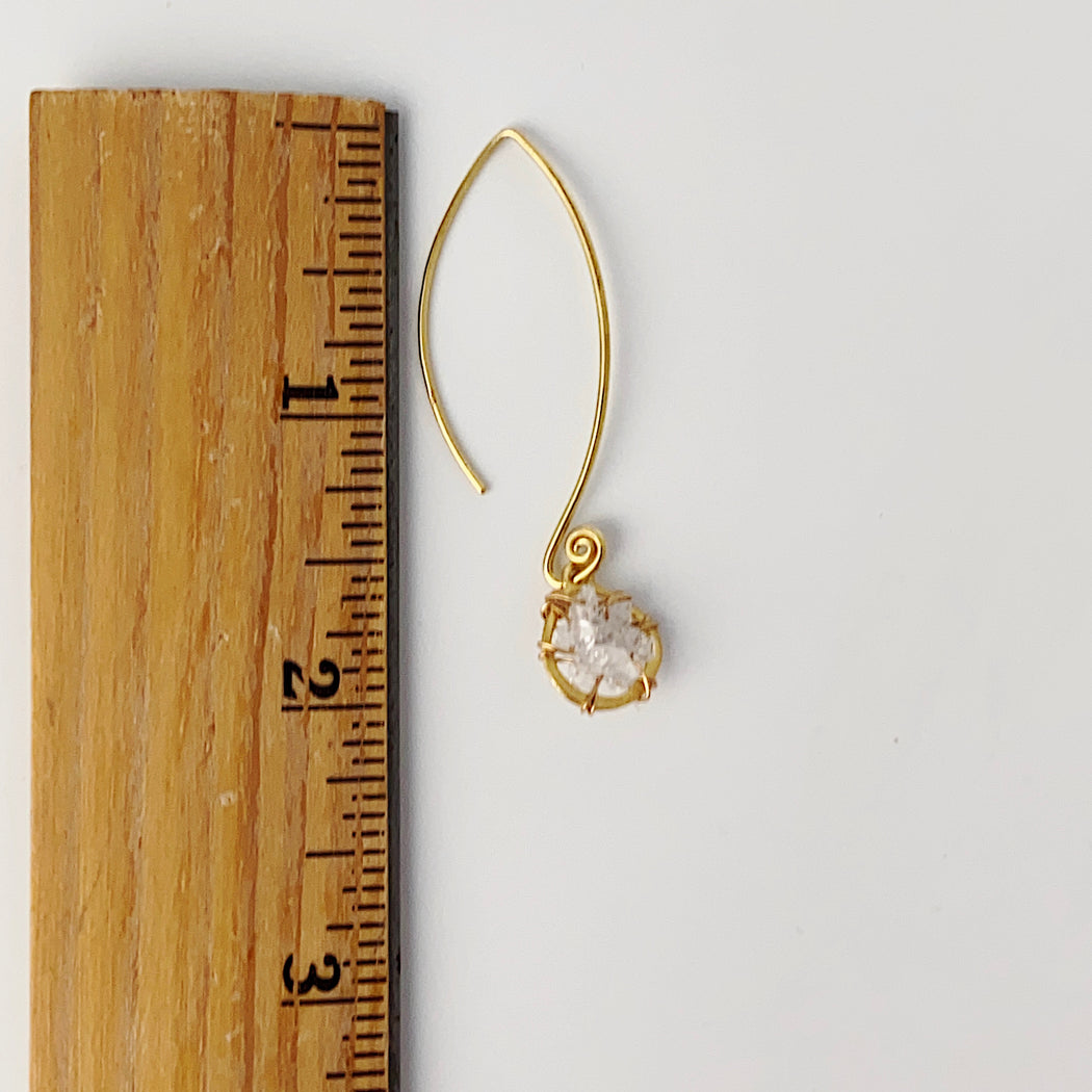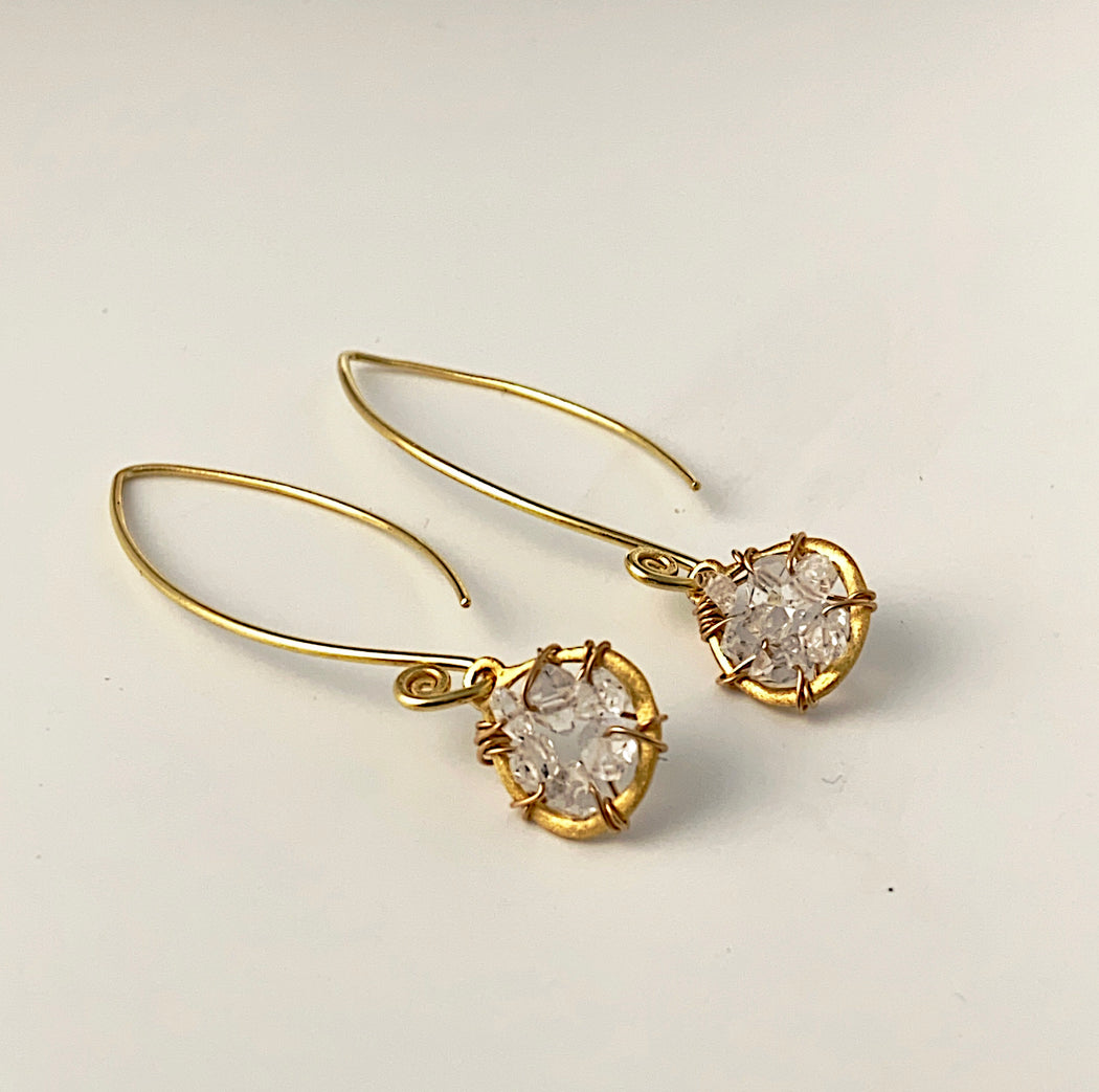 Herkimer diamonds, mined in Herkimer, NY, are arranged in a dream catcher design on a 14k gold-filled organic disc. The dream catcher earrings dangle from long, swirly 14k gold-filled ear wires. One of our best sellers!