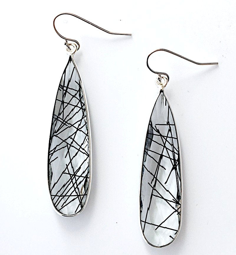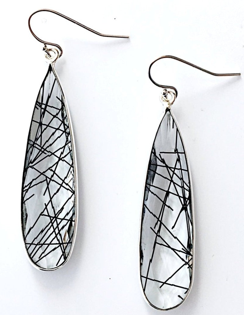 One of our bestsellers! These long Rutilated Quartz earrings are stunning -- long, sleek and elegant. Black rutile threads dance through these long quartz stones. Since each stone is unique, each pair of earrings is one of a kind. Wear these earrings and make a bold statement! Earrings measure 2 inches in length. Sterling silver ear wires.